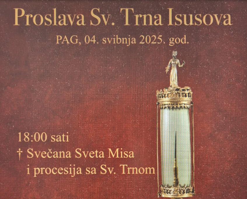 Grad Pag poziva građane, hodočasnike i posjetitelje na svečanu proslavu sv. Trna u Pagu koja će se održati u nedjelju, 4. svibnja 2025. godine s početkom u 18:00 sati, u Zbornoj crkvi Marijina Uznesenja u Pagu. Misno slavlje i procesiju predvodit će o. Louis-Marie Couillaud OSB, monah opatije Saint-Pierre de Solesmes iz Francuske.
