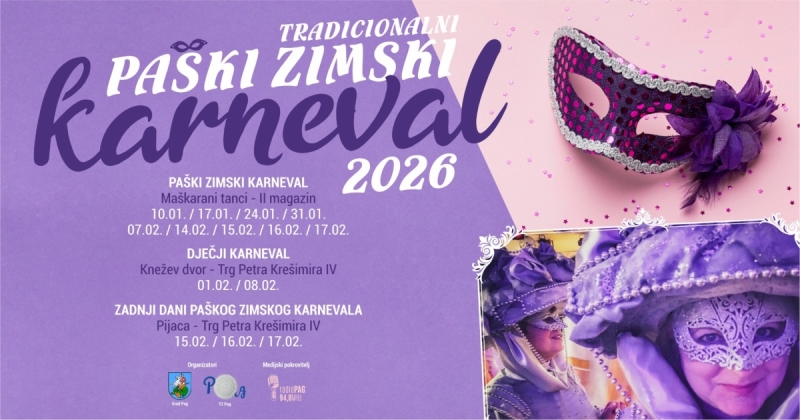 U organizaciji Grada Paga i Turističke zajednice Grada Paga održat će se tradicionalni Paški zimski karneval, jedno od najvažnijih zimskih događanja u gradu. Karneval, od 10. siječnja do 17. veljače 2026. godine, donosi raznolik program ispunjen glazbom, tancima i zabavom za djecu.